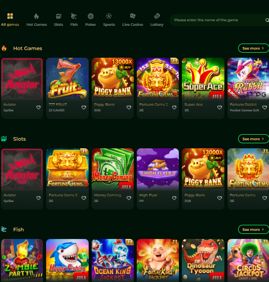 It includes slot games, fish games, sports, and e-sports.